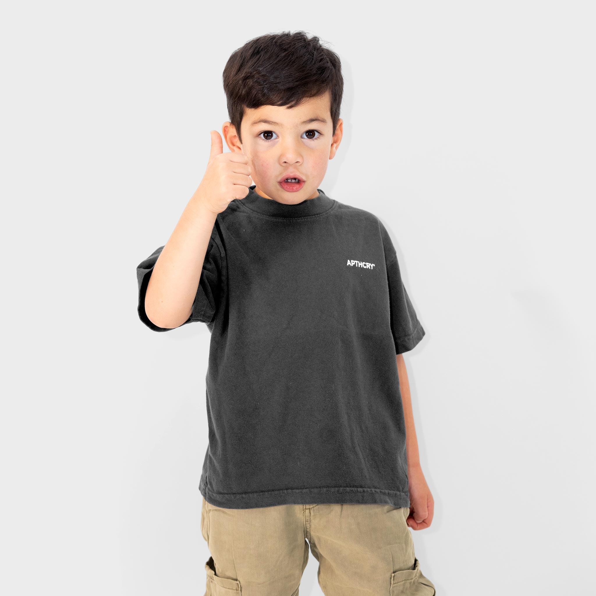 Heavyweight washed vintage black tee. Features a printed cream micro APTHCRY® logo on the front.