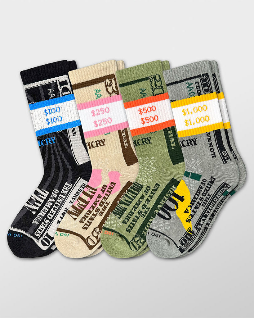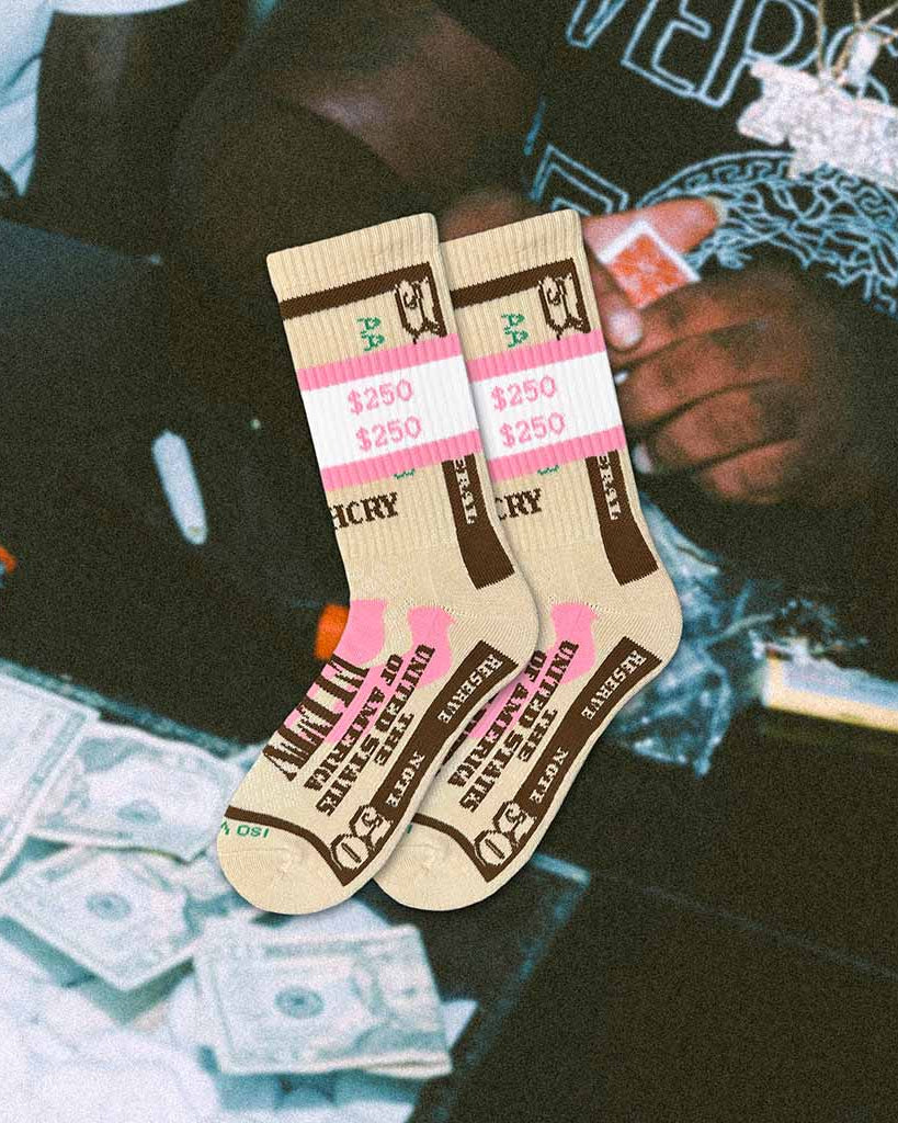 The Money Band Collection flips the look of currency straps into wearable street art. Inspired by the stacks every hustler dreams of, each pair represents a different level of ambition, from humble hundreds to high-roller thousands. Designed with bold denominations, crisp color bands, and premium comfort, this drop is all about chasing the bag and looking good while doing it.
