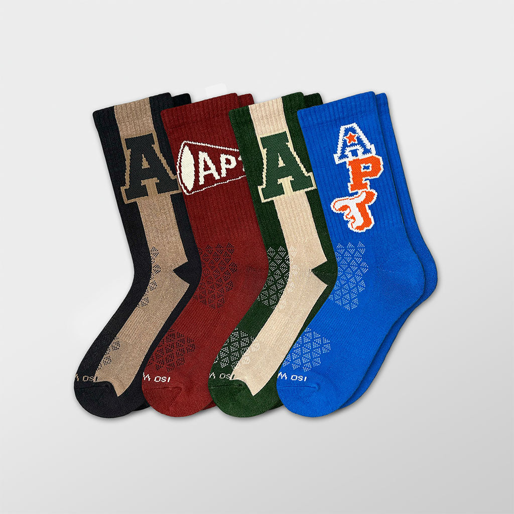 The Varsity Collection channels the nostalgia of game day with bold collegiate colors and classic campus graphics. From sideline chants to letterman pride, each pair captures the energy of student life, rivalries, and school spirit—built on APTHCRY’s commitment to detail and comfort.