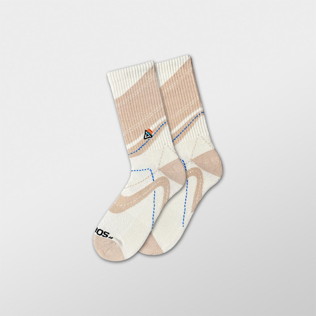 The Alaska sock takes the iconic panels and from the Alaska 1. They come in an off white, tan with blue and orange accents.